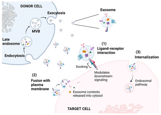 Receptor–ligand interactions are a common route for the mediation of immunomodulatory functions [141]. Transmembrane ligands on the exosome surface bind to receptors on the surface of the recipient cells and, depending on the nature of the ligand and receptor, specific downstream signaling cascades are subsequently activated or inhibited [142]. Exosomes also fuse directly to the recipient cell and release their contents into the cytosol [143]. Similar to cell membrane fusion, the lipid bilayer of the exosome partially fuses with that of the recipient cell with the help of Rab GTPases and SNARE family proteins, and eventually expands to form a consistent structure [144]. Exosomes can also undergo internalization by the recipient cell. The process of internalization may occur via various pathways, including clathrin-coated endocytosis, caveolin-mediated endocytosis, lipid-raft-mediated endocytosis, and phagocytosis [143,145,146,147]. However, the fate of the exosomes post-internalization is following the endosomal pathway and eventually fusing with the lysosome for degradation [136,148], or bypassing degradation and being directed to other cellular locations where they mediate functional changes [136].