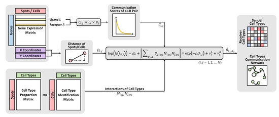 Different biochemical signalings from cellular communications control different activities of living organisms, which highlights the importance of understanding cell–cell communications (CCC) on biological processes and mechanisms [1,2]. In practice, we infer the CCC from some known ligand–receptor (LR) pairs because the interaction of LRs mediates communication. As single-cell RNA sequencing (scRNA-seq) technologies have matured, researchers have gradually gained opportunities to investigate CCC from scRNA-seq data since we know more about the ligand and receptor gene expression information and cell type annotation at the cellular level. Several approaches have been proposed for inferring the CCC from scRNA-seq data. For example, CellPhoneDB [3] calculates the mean of the average ligand expression level for one cell type and the average receptor expression level for another cell type and conducts a permutation test to determine the significance of this LR pair between two cell types. Instead of using the mean or product to measure the communication between two cell types, SingleCellSingleR [4] introduces a regularized product score for an LR pair and provides an ad hoc benchmark to decide an appropriate score threshold. In addition, CellChat [5] offers a more complicated measurement to reflect the interaction strength of an LR pair between cell types, but it also utilizes the permutation test to identify statistical significance. Even though these methods can infer cellular communications to some extent, one of the common limitations is that they do not consider the spatial information for each cell, which is crucial for cell signaling activities but lost in single-cell data. This restriction may lead to high false discovery rates in discovering intercellular communications [1].