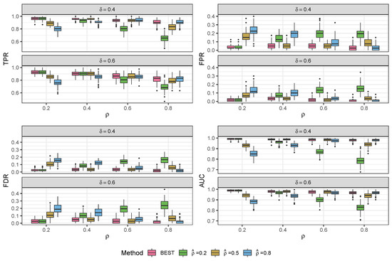 Results of BATCOM with different estimated ’s based on the simulation data generated from the proposed compound Poisson–Gamma model. All scenarios were , , and . TPR: true positive rate; FPR: false positive rate; FDR: false discovery rate; AUC: area under the ROC curve.