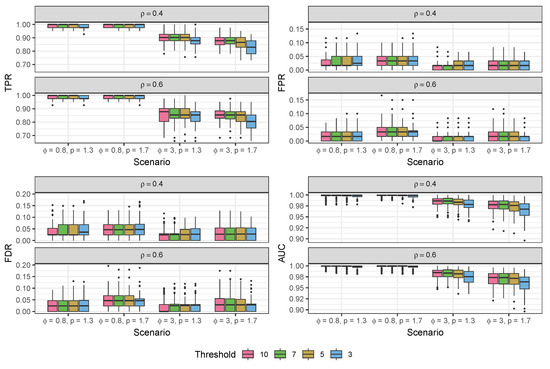 Results of BATCOM using different thresholds of distances of spots on the simulation data generated from the proposed compound Poisson–Gamma model. All scenarios were and . All methods here used . TPR: true positive rate; FPR: false positive rate; FDR: false discovery rate; AUC: area under the ROC curve.