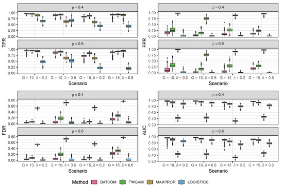 For each dataset, the inference of BATCOM was performed by estimating and fixing the random effects, running the MCMC algorithm, and considering FDR-corrected Wald tests as discussed in Section 2.4. After obtaining these results, we generated a confusion matrix for each simulated dataset by comparing the results with the true values. A true positive (TP) was recorded when the estimate had the same sign as the true value and the adjusted p-value was less than 0.05. Similarly, a true negative (TN) was counted when the adjusted p-value was larger than 0.05, and the true value was zero. Conversely, a false negative (FN) was registered if the adjusted p-value was greater than 0.05, but the true value was not zero. Any estimate with an adjusted p-value less than 0.05 for a true value of zero or an estimate with a sign different from the true value was counted as a false positive (FP). Using the confusion matrix from the analysis of each generated dataset, we calculated the true positive rate (TPR), false positive rate (FPR), and observed FDR. We also plotted the receiver operating characteristic (ROC) curve by setting different cutoffs of the adjusted p-value to compute the area under the curve (AUC). For each scenario, we calculated the mean and standard deviations of these measurements across 100 simulated datasets.