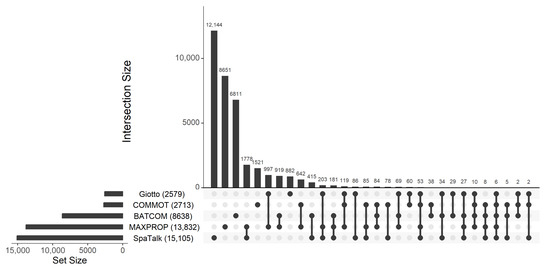 Figure 6 illustrates the UpSet plot for the number of significant CCC on LR pairs identified by different methods. As we can see, our proposed method, BATCOM, and MAXPROP detected the third and second highest number of significant communications, respectively, following SpaTalk, which identified the most significant results. It is not surprising that our proposed model (BATCOM) identified fewer significant CCC results than SpaTalk, as SpaTalk does not correct the p-values for multiple comparisons. In contrast, Giotto and COMMOT found the fewest communication pairs. Notably, MAXPROP identified many more significant CCCs than BATCOM, which is consistent with the higher FDR observed in the preceding simulations. Compared to Giotto and COMMOT, which also utilize the modal cell type, MAXPROP found more significant communications. Specifically, one-third to one-half of the results from Giotto and COMMOT overlapped with MAXPROP but disagreed with BATCOM, which is the version of our model that uses all available information about the spot’s cell type makeup.