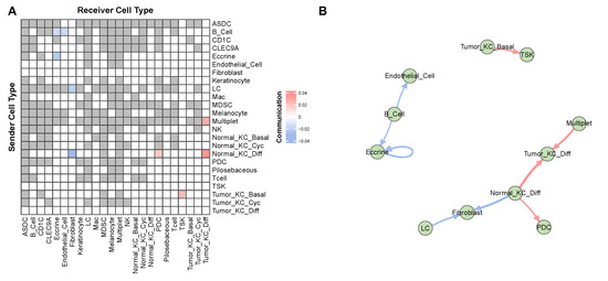 Figure 7 depicts the overall significant CCCs, indicating that cancer-related cells communicate closely with each other. Specifically, normal-differentiating keratinocytes (KC) exhibit positive communication with tumor-differentiating KC and plasmacytoid dendritic cells (PDC) while showing negative communication with fibroblasts. Notably, Ji et al. [33] found that the subpopulations of tumor KCs (basal, cycling, and differentiating) closely resemble the normal KC subpopulations, and they identified a fourth major tumor KC subpopulation, called tumor-specific keratinocytes (TSK), that exclusively exists in tumor skin and distinguishes itself from other tumor cells. Furthermore, Ji et al. [33] discovered that TSK and tumor-basal KC are both present in the leading edge of the tumor. Our results are consistent with these findings, as Figure 7 shows that tumor-basal KC frequently communicates with TSK.