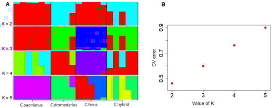 (A) ADMIXTURE analysis for Camelus bactrianus, Camelus dromedarius, Camelus ferus, and Hybrid camel (K value shown from 2 to 5). (B) The CV error of each K value.