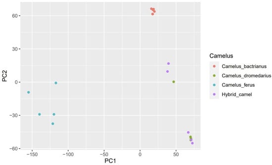 Principal component analysis (PCA) of Camelus bactrianus, Camelus dromedarius, Camelus ferus, and Hybrid camel samples based on SNP data. All samples are represented by a dot and are colored according to the type of camel.