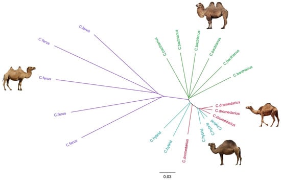 Phylogenetic tree constructed with the neighbor-joining (NJ) method for Camelus bactrianus, Camelus dromedarius, Camelus ferus, and Hybrid camel. (Images of camels not to scale and were taken from open sources http://www.pinterest.com/, accessed on 12 May 2023).