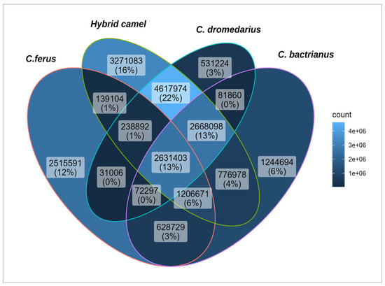 A comparison of identified SNPs of the studied groups revealed 2,631,403 SNPs (13%) shared across all populations. Interestingly, hybrid camels had the largest number of unique SNPs (3,271,083), pointing to their genetic distance from other studied groups of camels. Additionally, 2,515,591 of the identified SNPs are unique to wild camels, while in Bactrians, this number is 1,244,694, and the fewest private SNPs were found in dromedaries (531,224). Hybrids and dromedaries had the most significant number of common SNPs (22%), which was significantly less than those in hybrids with Bactrians and hybrids with wild camels (4% and 1%, respectively). This also confirms the proximity of hybrids to dromedaries. Additionally, it should be noted that 13% of the identified SNPs were common for hybrids, dromedaries, and Bactrians, which is quite logical, given that dromedaries and Bactrians are the genetic parents of hybrid camels [11]. Wild camels also share more SNPs with Bactrians than with dromedaries, consistent with the results of the 128 camel sequencing data [44]. Since the Bactrians and dromedaries used in this study have different geographical origins, hailing from either Kazakhstan or Iran, future studies should aim to comparatively analyze Bactrians and dromedaries of Kazakhstan origin to check the presence of common SNPs, taking inspiration from earlier research works [23,46].
