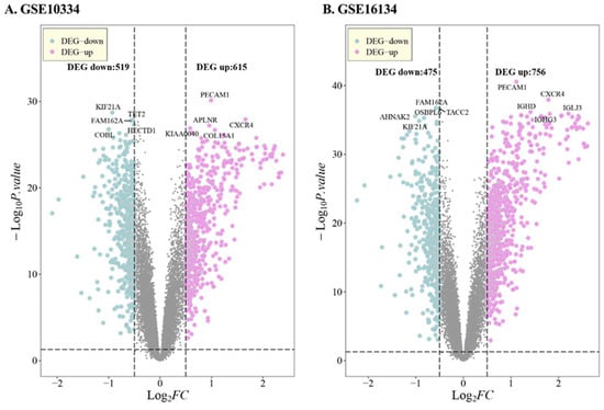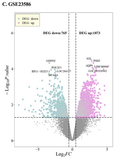 Differential expression analysis. Top5 of DEG-up and DEG-down significant genes are marked in the figure, respectively. (A) shows the expression in GSE10334, (B) in GSE16134 and (C) in GSE23586 datasets.