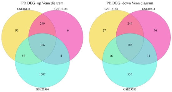 Genes with p-value < 0.05, |log2(FC)| > 0.5 were seen as differentially expressed genes, where Log2(FC) > 0.5 was upregulated and log2(FC) < −0.5 was downregulated. The results of the difference analysis are shown in Table 1. Figure 1 illustrates a volcano map, showing the regions where the datasets differed in genes, whereby the significant Top5 genes in different regulatory genes are depicted. Taking the intersection of DEGs of GSE10334, GSE16134, and GSE23586, a total of 489 PD-associated DEGs were obtained, of which 306 were co-upregulated and 183 were co-downregulated (Figure 2).