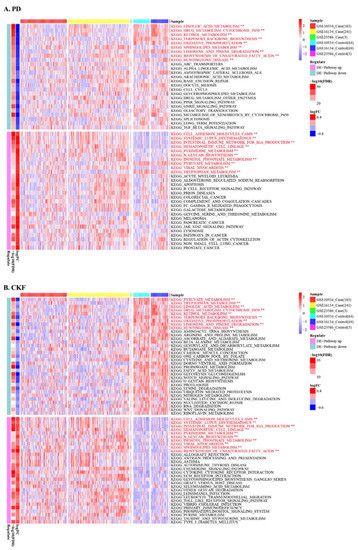 All samples in GSE10334, GSE16134, and GSE23586 were merged, resulting in a PD expression matrix consisting of 427 case and 136 control samples. From there, 489 PD-associated DEGs and 805 CKF-associated genes were extracted from the expression matrices, and these were the basis for GSVA analysis on the two sets of expression matrices (Figure 4). The results of limma analysis based on PD-related DEGs had median (|log FC|) = 0.413, so in PD log2FC < 0.413 was considered a differentially upregulated pathway and log2FC < −0.413 a differentially downregulated pathway. Based on the results of limma analysis of CKF-related genes in median (|log FC|) = 0.228, CKF log2FC < 0.228 was considered a differentially upregulated pathway and log2FC< −0.228 a differentially downregulated pathway.