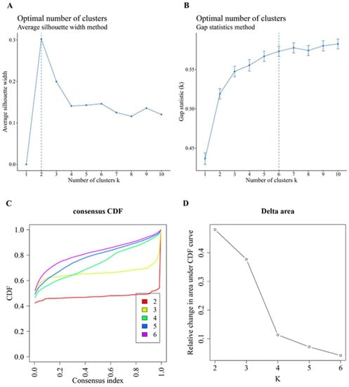 Consensus Cluster Plus analysis. (A,B) Average silhouette width and elbow method analysis results for PD & CKF significantly different pathway datasets; (C) Consensus cumulative distribution function (CDF) plot. This plot shows the cumulative distribution function of the scores when k takes different values. (D) Results of the relative change in area under the CDF curve for k and k-1 compared to the CDF curve. When k = 2 (since the data are not generally clustered into 1 class, there is no k = 1), the first point indicates the total area under the CDF curve at k = 2 (i.e., the area under the line in (A,B)), not the relative change in area. Choosing the final k value, the descending slope of the line in Figure 5C must be as small as possible, and the relative change in area under the CDF curve in Figure 5D for k and k-1 must be as small as possible compared to the area under the CDF curve.