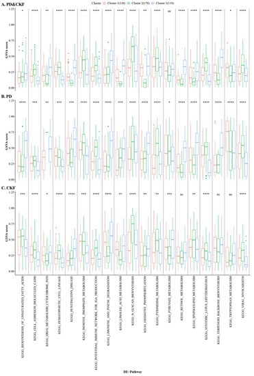 In addition, the case sample of PD&CKF significantly different pathway dataset was divided into different clusters (Figure 5C,D) using Consensus Cluster Plus algorithm. The results obtained the best clustering when k = 3. Figure 6 shows the sample correlation results in the two datasets at k = 3 (Figure 6A), as well as at k = 2 and k = 6 (Figure 6B,C). For the three datasets of the PD & CKF significantly different pathway dataset, the PD significantly different pathway dataset, and the CKF significantly different pathway dataset, the Kruskal test was used to compare the difference of cluster in the three datasets (Figure 7A–C). Results were obtained for most pathways with significant differences between clusters.