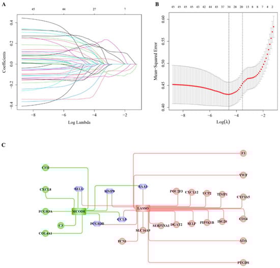 Hub cross-talk gene screening results. (A) Results of LASSO analysis; each line in the graph represents a gene, and the larger value of the horizontal coordinate (Log Lambda) when the gene tends to 0 indicates that the gene is more critical. (B) Results of model cross-validation. There are two dashed lines in the graph; one is the λ value lambda.min, when the mean square error is smallest, and the other is the λ value lambda.1se, when the mean square error is smallest, and either one of these two values can be chosen. (C) Intersecting genes in the hub genes (MCODE) and the 19 hub genes (LASSO).