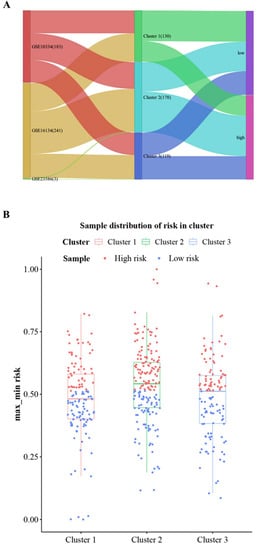 The regression coefficients of the five hub cross-talk genes were evaluated within LASSO regression analysis, which was the basis for calculation of the case sample risk score alongside with the hub cross-talk gene expression matrix. Then, the risk scores were min–max normalized and the samples were divided into high-risk and low-risk groups according to the median. Subsequently, the distribution of high- and low-risk samples was analyzed in Series, Cluster, and Risk (Figure 9A,B). The results found that the high-risk samples were mainly concentrated in Cluster2. This indicates that patients in Cluster2 are at higher risk than the other two groups.