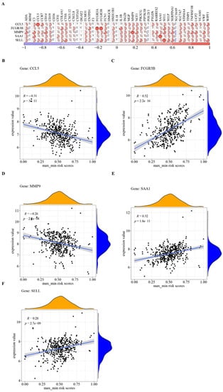 The results obtained were highly positive correlations between FCGR3B and FCGR3A (cor = 0.9671), MMP9 and CD14 (cor = 0.7384), SELL and CTSS (cor = 0.7207), and SAA1 and C3 (cor = 0.6743). SELL, FCGR3B, and SAA1 were significantly negatively correlated with sample SELL; FCGR3B and SAA1 were significantly positively correlated with sample risk; and CCL5 and MMP9 were significantly negatively correlated with sample risk.