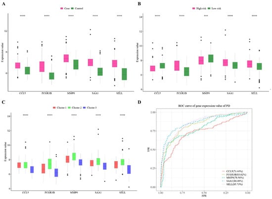 (A–C) Hub cross-talk gene expression levels in case–control cluster and high-risk vs. low-risk samples. The smaller the p-value of the test results, the more significant the sample difference results, while the more “*” on the graph, the p-value and “*” sign correspond to ***: p ≤ 0.001, ****: p ≤ 0.0001; (D) ROC assessment of hub cross-talk genes.