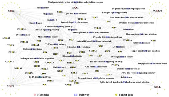 PPI relationship pairs were analyzed between the hub cross-talk genes and other genes from the results of PPI network analysis, which we noted as hub gene–target1 relationship pairs. Based on the KEGG database (https://www.kegg.jp/ (assessed on 8 November 2022), the hub gene–pathway relationship pairs were assessed. Based on the pathways in the hub gene–pathway relationship pairs, the genes under these pathways were extracted from KEGG, so the pathway–target2 relationship pairs were obtained. Hub gene–target1 relationship pairs, hub gene–pathway relationship pairs, and pathway–target2 relationship pairs were merged to construct hub gene–pathway–target2 composite relationship pairs. Then, the genes in target1 were screened from the target2 gene set to form the target1–hub gene–pathway–target1 by closed-loop relationship chain. Finally, Cytoscape was used to construct the target1–hub gene–pathway–target1 closed-loop structural network.