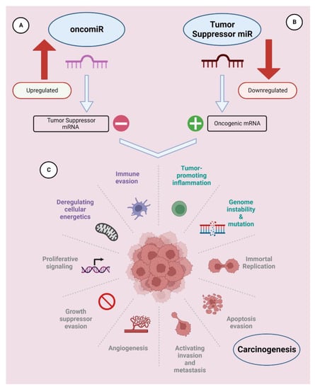 miRNAs can be classified as oncomiRs and tumor suppressors. (A) OncomiRs suppress tumor-suppressor gene translation and promote tumor cell growth through constitutive overexpression. (B) Tumor-suppressor miRNAs inhibit tumorigenesis and subsequent cancer development by suppressing the translation of mRNAs that encode for oncogenes. (C) Hallmarks of carcinogenesis. This figure was created using Biorender.