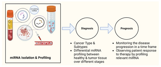 MiRNAs as cancer biomarkers: potential clinical applications. miRNAs are isolated from tumor tissue, saliva, blood, plasma, serum, etc., and then profiled for miRNA expression. miRNA profiling helps in cancer diagnosis, cancer staging, and therapeutics. This figure was created using Biorender.