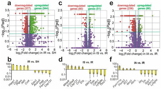 Three animals (n = 3) were included in each of the comparison groups (SH, IR, IS, IA) for RNA-Seq experiments. Cuffdiff/Cufflinks software was used for genes annotations, as previously described [31]. The levels of mRNA expression were measured using the Cuffdiff program, as previously described [24]. Only the genes that exhibited >1.5-fold changes in expression and had a p-value (t-test), adjusted using the Benjamini–Hochberg procedure, lower than 0.05 (Padj < 0.05) were considered.