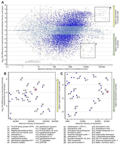MA-plot of genome-wide gene expression data of both cell types. Each dot in this two-dimensional MA-plot represents both the absolute expression intensity of a given gene and the differences in expression of this gene between somatic cells and gonidia. More specifically, A-values (X-axis) represent the averages of absolute intensity of expression (mean of normalized counts) of a given gene in logarithmic scale, and M-values (Y-axis) represent the log2 fold difference in expression intensity of the same gene between the two cell types (somatic cells versus gonidia). Genes are classified as being expressed in a cell type-specific manner if the difference in expression between the two cell types is ≥2 and the significance value is ≤0.05, and they are shown with brilliant blue dots. Genes that do not meet these criteria are shown with light blue dots. The underlying RNA-Seq data originate from a previous whole transcriptome analysis [4]. (A) Full MA-plot (Bland–Altman plot) of the expression dataset. At total of 7691 genes (54%) show cell type-specific expression (brilliant blue dots). About half of them, more precisely 3728 genes (26%), show overexpression in somatic cells, and about half, more precisely 3963 genes (28%), show overexpression in gonidia. A total of 6556 genes (46%) do not show cell type-specific expression (light blue dots). Adapted from [4], with permission from BMC Biology, 2017. (B,C) Magnification of image sections highlighted in (A) showing genes with both very strong and cell type-specific overexpression in somatic cells and gonidia, respectively. Promoter regions of genes meeting these two criteria were considered candidates for cell type-specific overexpression of genes of interest in V. carteri. The names of the proteins encoded by the candidate genes are listed and further details are given in Supplementary Table S1. The two genes finally selected for expression analyses are circled in red in (B,C), respectively.