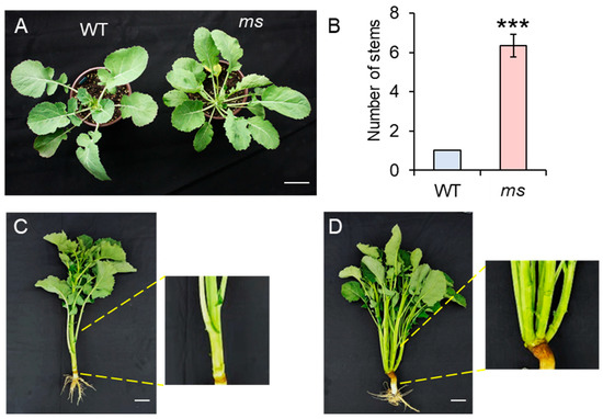 (A) The phenotypes of wild-type (WT) and multi-stem (ms) mutants after germination at 60 days. Bar = 5 cm. (B) The numbers of the main stems of the WT and ms mutant. Values are the means (±SDs) (two-tailed Student’s t-tests; *** p < 0.001; n = 10). (C) The phenotypes of the WT and (D) ms mutant after germination at 120 days. Bar = 10 cm. The yellow lines indicate the enlargement of the base of the stem in the WT and ms mutant plants.
