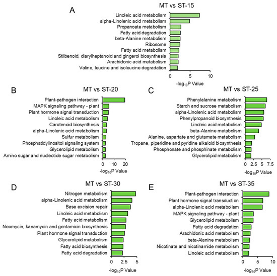 KEGG enrichment analysis of DEGs between ms mutant and WT. Top 10 KEGG pathways of DEGs in ms mutant compared with WT at (A) 15, (B) 20, (C) 25, (D) 30, and (E) 35 days after germination. ST: time after germination of single-stem plants (WT); MT: time after germination of multi-stem (ms) mutants. Complete data can be found in Table S4.