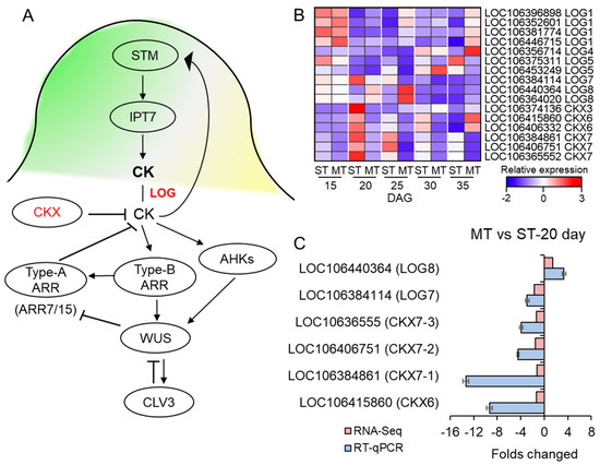 The expression of genes involved in cytokinin signaling. (A) The gene networks involved in the cytokinin (CK) signaling pathway. LOG positively regulates CK synthesis, and CKX negatively regulates the synthesis of CK. CK signaling positively regulates WUS in a manner that is dependent on type-B ARRs; type-B ARRs directly activate type-A ARRs, which act as negative-feedback regulators of CK signaling, and WUS represses type-A ARRs (ARR7/15). CK also positively regulates WUS transcription via cytokinin receptors called AHKs. Adapted from [48]. (B) Heatmap of the LOG and CKX gene family in WT (S) and ms mutant (M) at 15, 20, 25, 30, and 35 days after germination (DAG). The colors correspond to the average FPKMs of three replicates, ranging from blue (low expression) to red (high expression). Complete data can be found in Table S5. (C) RT-qPCR and the RNA-seq indicated the relative expression (fold change) of the LOG and CKX genes in the ms mutant (M) relative to the WT (S) at 20 days after germination. ST: time after germination of single-stem plants (WT), MT: time after germination of multi-main-stem (ms) mutants.