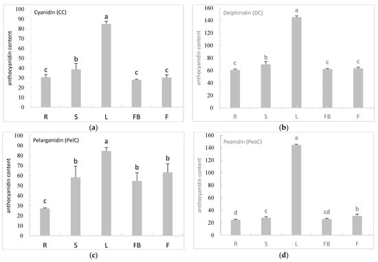 The concentration of six anthocyanidins in different tissues of A. sinicus. Data represent mean ± SD of three biological replicates. Means denoted by the same letter did not differ significantly at p < 0.05 according to Duncan’s multiple-range test. Vertical bars indicate the standard deviation of the mean. Roots (R), stems (S), leaves (L), flower buds (FB), and flowers (F). (a) The concentration of Cyanidin (CC). (b) The concentration of Delphinidin (DC). (c) The concentration of Pelargonidin (PelC). (d) The concentration of Peonidin (PeoC). (e) The concentration of Petunidin (PT). (f) The concentration of Malvidin (MV).