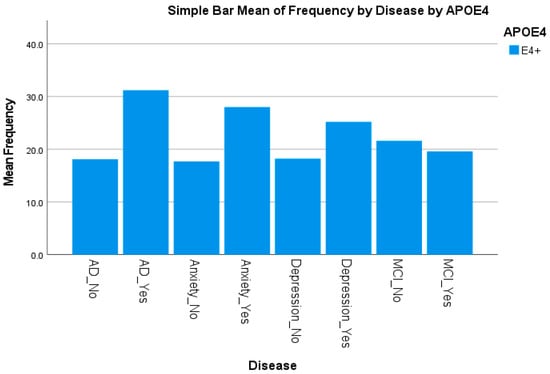 This study included 1382 Hispanic participants collected by the TARCC and ISLD-RGV; from the total participants, only 1320 were genotyped and assigned their corresponding APOE allele status. APOE genotypes were tested with Hardy–Weinberg equilibrium (HWE) (pHWE > 0.05). In total, 921 (69.8%) of the subjects were females, and 399 (30.2%) of the subjects were males, with a mean age of 68.95 ± 9.47 years. The clinical phenotypic frequencies based on APOE-ε4 allele status for the 1,320 participants are displayed in Table 1. A total of 20.6% of females and 22.2% of males carried at least one APOE-ε4 allele (Table 1). The APOE-ε4 allele was not only associated with AD (31.2%) compared with normal cognition (18.1%) (p < 0.0001) but was also associated with depression (p = 0.002) and anxiety (p < 0.0001). Figure 1 shows the APOE-ε4 frequency by AD status and mental health disorders (e.g., depression or anxiety). No difference in APOE-ε4 status was observed for BMI, MCI, and education.