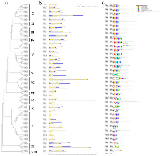 Unrooted phylogenetic tree, genomic sequence structure, and conserved motif analysis of protein sequences of the LcNACs. (a) The neighbor-joining tree on the left is constructed from 112 LcNAC proteins. The subgroups (Groups Ⅰ-XIII) are listed on the right side of the phylogenetic tree. (b) Yellow color indicates the LcNAC sequence coding region (CDS), purple color indicates untranslated 5’ and 3’ regions, and black solid line indicates introns. (c) The 10 conserved motifs are indicated by different colored boxes.