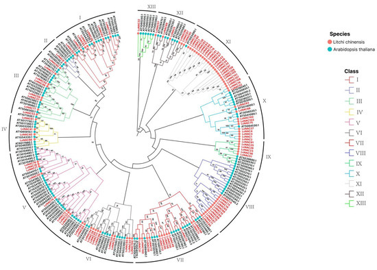 To further explore the conserved relationships of NAC family genes in litchi, we performed multiple sequence alignment of 112 LcNAC protein sequences using Mega 6.0 software, and the results of the alignment were used to construct a phylogenetic tree according to the neighbor-joining (N-J) method. The phylogenetic tree results showed that the 112 NAC proteins were classified into 13 subgroups (Figure 2a: Groups I-XIII), and among these 13 subgroups, group “XI” contained the largest number of 23 genes. The smallest subgroups were groups “VIII” and “XIII”, each of which contained only three sequences. In terms of evolutionary relationships, there is a relatively significant difference between group XIII and XII. Group XIII and XII were significantly divided into two major branches throughout the evolutionary tree, implying that there may be relatively large differences in gene function.