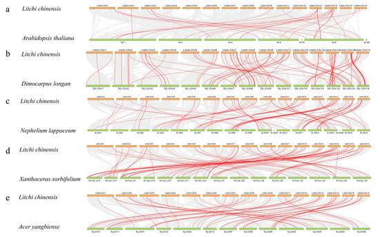 Analysis of co-linearity of NAC genes between litchi and five representative plant species. The gray lines in the background indicate adjacent blocks in the genomes of litchi and other plants while the red lines highlight co-linear NAC gene pairs. (a–e) show the covariance of NAC genes between litchi and five representative plants, respectively.