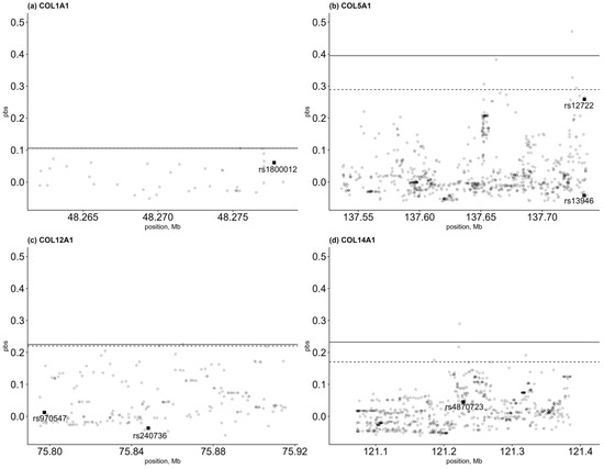 PBS representation of (a) COL1A1, (b) COL5A1, (c) COL12A1, and (d) COL14A1. The 99.5th (dotted horizontal lines) and 99.9th percentiles (continual horizontal lines) of the empirical distribution are shown in the plot. The SNPs under scrutiny are indicated with a square.