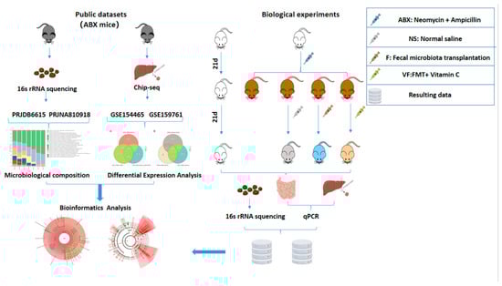 High-throughput RNA sequencing data were downloaded from the Gene Expression Omnibus (GEO) database (http://www.ncbi.nlm.nih.gov/geo/, accessed on 1 June 2022); we selected datasets, GSE154465 and GSE159761, which used the same antibiotics as we did. GSE154465 contains liver mRNA expression profiles from aged and control-aged mice that were recolonized by two different microbial community types, PAM I and PAM II, after early life exposure to antibiotics, and PAM II-colonized mice had a significantly shorter lifespan compared to PAM I and ABX-free mice. GSE159761 contains liver mRNA expression profiles for day 14 and control in ABX-treated hormonal mice after 14 days. Both datasets use neomycin (0.5 mg/mL) and ampicillin (1 mg/mL) as antibiotic treatments.