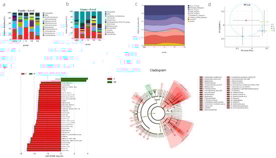 (a) Species composition at family level in each group; (b) species composition at genus level in each group; (c) river diagram of the results of microbial phenotyping analysis results; (d) weighted UniFrac based PCoA results; and (e) LEfSe results based on indicator species.