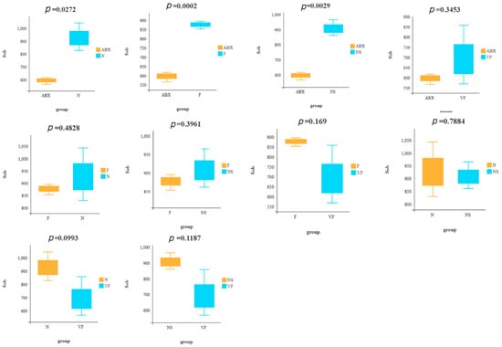 Our analysis of the public database of 16s rRNA data (PRJNA810918) revealed that mice receiving 8 consecutive weeks of FMT from mice not treated with antibiotics still did not return to normal mouse levels of α diversity (Supplementary Figure S1). To assess the recovery of gut microbiota in each group, we utilized Sob- and Chao1-based α diversity and performed a t-test for Sob-based α diversity in any two groups (Figure 4). Our results showed that, in terms of diversity alone, the NS group exhibited the best recovery, followed by the F and VF groups. However, after 21 consecutive days of treatment, the α diversity was still not as good in either the F, NS, or VF groups as in the N group (Figure 2f,g). This suggests that the recovery of the gut microbiota after oral antibiotic administration may take a considerable amount of time.