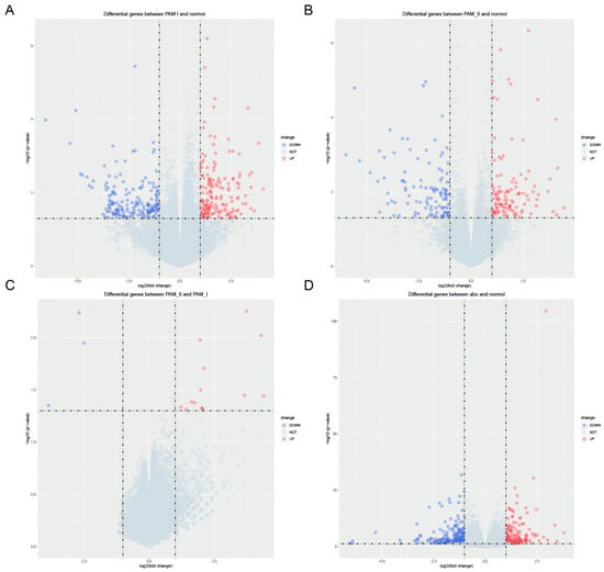 To investigate the effects of antibiotic treatment on gene expression, we obtained datasets GSE154465 [] and GSE159761 [] from public databases, which employed neomycin (0.5 mg/mL) and ampicillin (1 mg/mL) as antibiotics, the same as those used in our study. We verified the differential gene expression following antibiotic treatment through the utilization of Quantitative Real-time-PCR. In GSE154465, we found 343 homologous genes that were significantly differentially expressed in PAM I-colonized mice compared to normal ABX-free mice, with 168 exhibiting high expression and 175 displaying low expression (Figure 5A). Similarly, we observed 223 differentially expressed homologous genes in PAM II-colonized mice relative to normal ABX-free mice, 114 of which exhibited high expression and 109 displayed low expression (Figure 5B). Seventeen homologous genes were significantly differentially expressed in PAM II-colonized mice compared to PAM I-colonized mice, of which 14 were highly expressed genes and 3 were lowly expressed genes(Figure 5C). In GSE159761, ABX-treated tumor-bearing mice exhibited significant differential expression of 412 homologous genes compared to normal mice, including 188 highly expressed genes and 224 lowly dexpressed genes (Figure 5D).