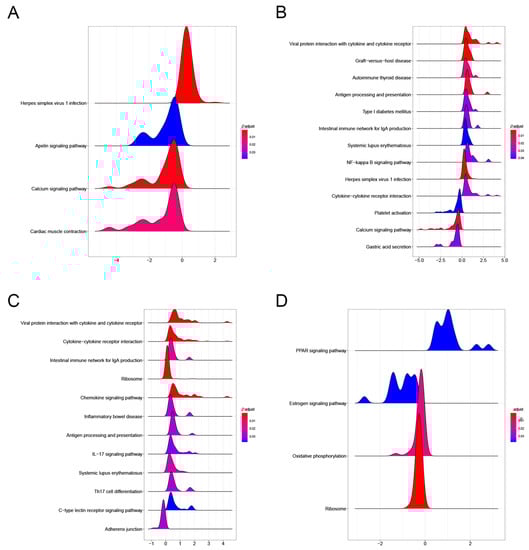 KEGG results showed that PAM I colonization in GSE154465 was mainly enriched in four pathways, namely the Herpes simplex virus 1 infection, Calcium signaling pathway, Cardiac muscle contraction, and Apelin signaling pathway, compared to normal ABX-free mice (Figure 6A). PAM II colonization, compared to normal ABX-free mice, was mainly enriched to Viral protein interaction with cytokine and cytokine receptor, Herpes simplex virus 1 infection, Calcium signaling pathway, and 13 other pathways (Figure 6B). The major enrichment pathways, Herpes simplex virus 1 infection, Viral protein interaction with cytokine and cytokine receptor, and Herpes simplex virus 1 infection, are all immune-related. PAM II colonization was enriched in 12 pathways, including cytokine–cytokine receptor interaction, Viral protein interaction with cytokine and cytokine receptor, and Ribosome, compared to PAM I-colonized mice (Figure 6C). In contrast, the tumor-bearing mice in GSE159761 were mainly enriched in four pathways, including Ribosome, Oxidative phosphorylation, and others, compared to normal mice (Figure 6D).