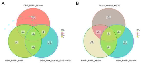 (A) Differential genes in GSE154465 for PAM II-colonized compared to ABX-free mice and PAM II-colonized compared to PAM I-colonized mice and in GSE159761 for ABX-treated tumor-bearing mice compared to normal mice. (B) KEGG pathway gene crosses in PAM II-colonized compared to PAM I-colonized mice and ABX-free mice and differential gene crosses in PAM II-colonized compared to ABX-free mice.