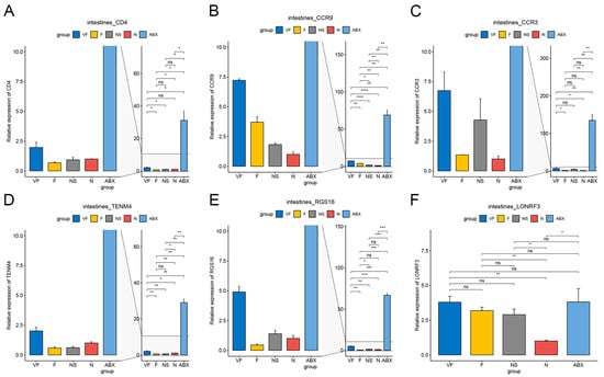 qPCR results of 6 genes in intestine with different treatments. (A) Cd4, (B) Ccr9, (C) Ccr3, (D) Tenm4, (E) Rgs16, and (F) Lonrf3. (*: p < 0.05,**: p < 0.01,***: p < 0.001).