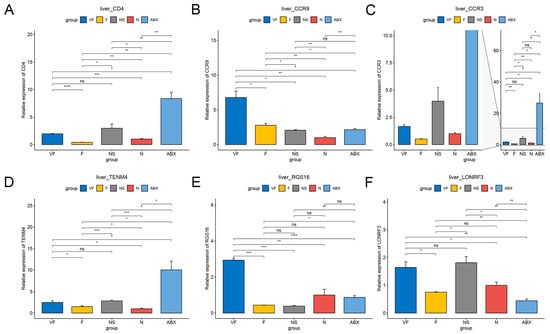 To investigate the perturbation of gene expression in mice by ABX treatment and the recovery of each group, we examined the changes in the expression of these six genes in the small intestine and liver of mice in the ABX, VF, F, NS, and N groups by qPCR.