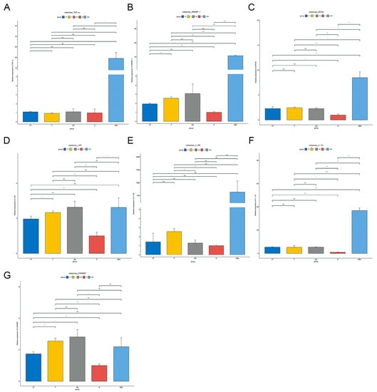 Gene qPCR results from different treated mice in the gut. (A) TNF-α, (B) Srebp-1, (C) Mfns, (D) LXR, (E) IL-6R, (f) IL-1β, and (G) Chrebp. (*: p < 0.05,**: p < 0.01,***: p < 0.001).