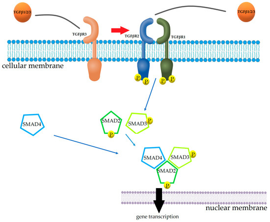 TGFβ receptor (TGFβR) is a serine/threonine protein kinase present mainly on the cell surface. The receptor includes three isoforms: TGFβR1, TGFβR2, and TGFβR3 (the last one lacks kinase activity). TGFβ1-related signalling pathways are activated by the binding of TGFβ1 to its receptor [45,46].