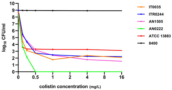 In the time–kill assay curves, colistin initially displayed a rapid bactericidal effect against all the strains, as evidenced by the (≥7 log10 to ≤3 log10 CFU/mL) decrease within 1 h of exposure (Figure 2). However, after 2–4 h of exposure to colistin, there was an increase in the number of colonies (≥7 log10) in all the CH strains except the CS strain AN0222 (Figure 2). This indicated that colistin was ineffective at completely eradicating these three CH strains due to the selection and enrichment of the resistant subpopulation after initially killing the susceptible population.