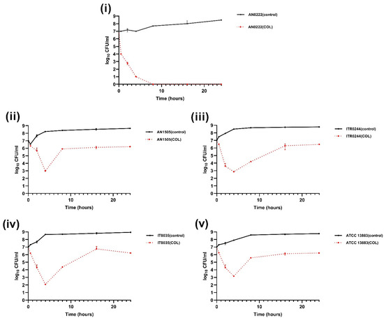 Time–kill curves of 2 mg/L colistin (COL). CS strain (i) AN0222 displayed sharp decrease in colony counts when exposed to colistin with no regrowth observed over time. CH strains (ii) AN1505, (iii) ITR0244, (iv) IT0035, (v) ATCC 13883 displayed an initial decrease followed by increasing colony counts (colistin resistant subpopulation) after 2–4 h of exposure to colistin.
