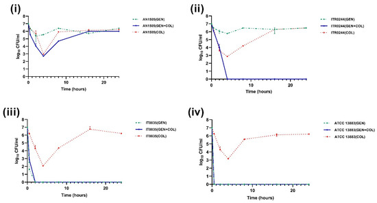 Time–kill curves of 2 mg/L colistin combined with 16 mg/L gentamicin (GEN). Except CH strain (i) AN1505, the resistant subpopulation was found to be eliminated in case of all other CH strains (ii) ITR0244, (iii) IT0035 and (iv) ATCC 13883 when exposed to colistin + gentamicin combination.
