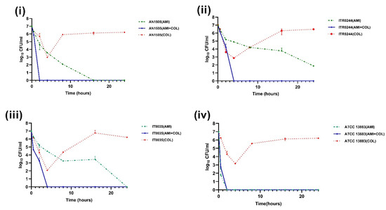 Time–kill curves of 2 mg/L colistin combined with 64 mg/L amikacin (AMI). The colistin resistant subpopulation was found to be eliminated in all the CH strains (i) AN1505, (ii) ITR0244, (iii) IT0035 and (iv) ATCC 13883 when exposed to colistin + amikacin combination.