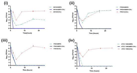 Time–kill curves of 2 mg/L colistin combined with 23 mg/L meropenem (MER). The colistin resistant subpopulation was found to be eliminated in case of all the CH strains (i) AN1505, (ii) ITR0244 (iii) IT0035 and (iv) ATCC 13883 when exposed to colistin + meropenem combination.
