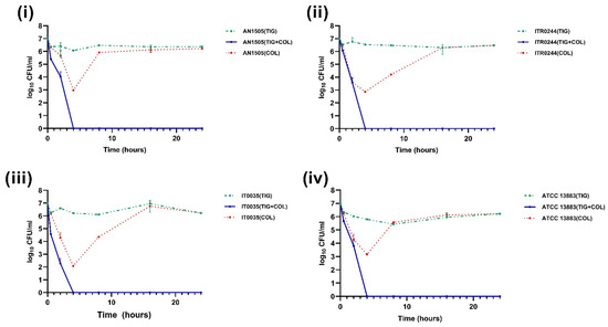 Time–kill curves of 2 mg/L colistin combined with 1 mg/L tigecycline (TIG). The colistin resistant subpopulation was found to be eliminated in all the CH strains (i) AN1505, (ii) ITR0244 (iii) IT0035 and (iv) ATCC 13883 when exposed to colistin + tigecycline combination.